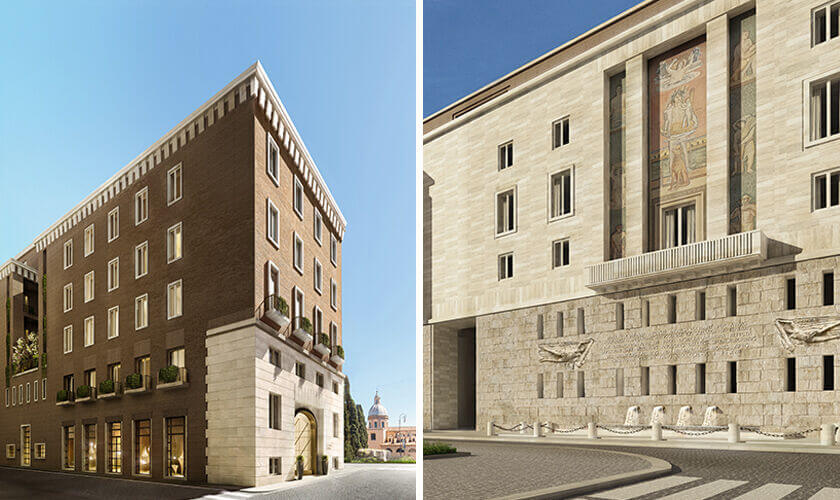 Das neue Bvlgari Hotel Roma wird in einem prächtigen Gebäude untergebracht sein, das zwischen 1936 und 1938 nach einem Entwurf des Architekten Vittorio Ballio Morpurgo erbaut wurde. Das Haus steht vor zwei der symbolträchtigsten römischen Wahrzeichen, dem Ara Pacis und dem Mausoleum von Augustus, dem ersten römischen Kaiser. Es zeigt eine monumentale, moderne Architektur, die durch die Verwendung traditioneller römischer Materialien und Farben, wie ockerfarbenen Travertin Marmor und gebrannten roten Ziegelsteinen, betont wird.